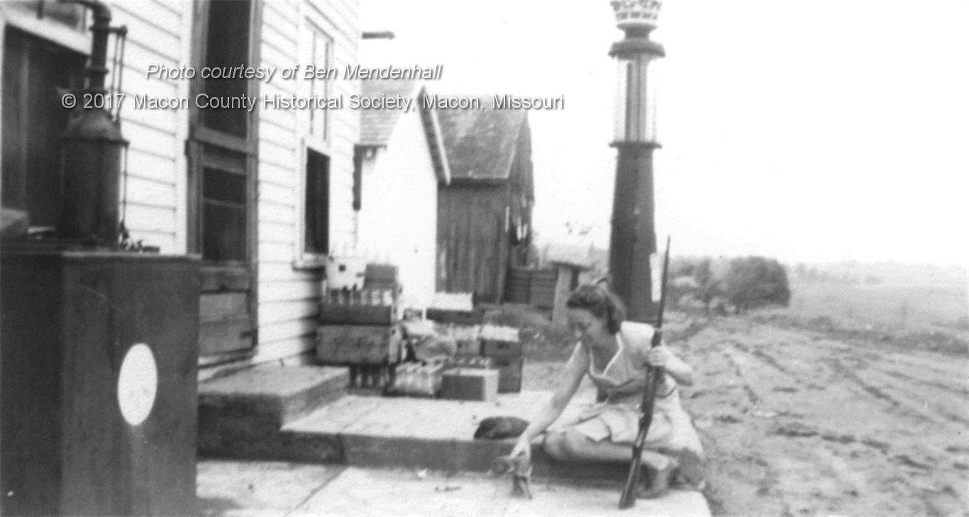 Hart General Store and Filling Station, Hart, Missouri, circa 1950. A well-armed Ruth Standley is shown tending a puppy. Photo courtesy of Ben Mendenhall.