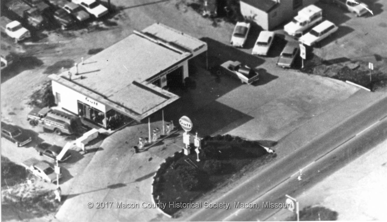 Aerial view of the Gulf Service Station, east of the US Highway 36-63 Junction on the south side of US Highway 36, looking southwest, circa 1970.
