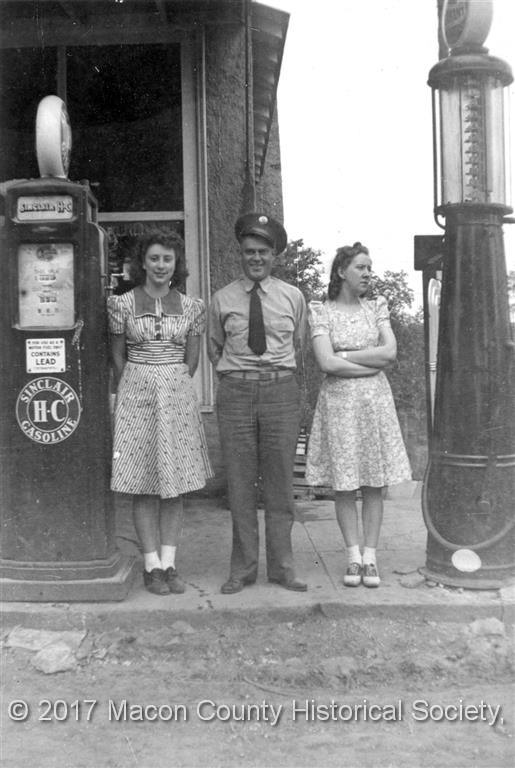 Wright’s Grocery Store and Sinclair Filling Station, looking east, College Mound, Missouri, 1942. Pictured left to right are Betty Watkins, Waldo Hendricks and Dorothy Gipson.
